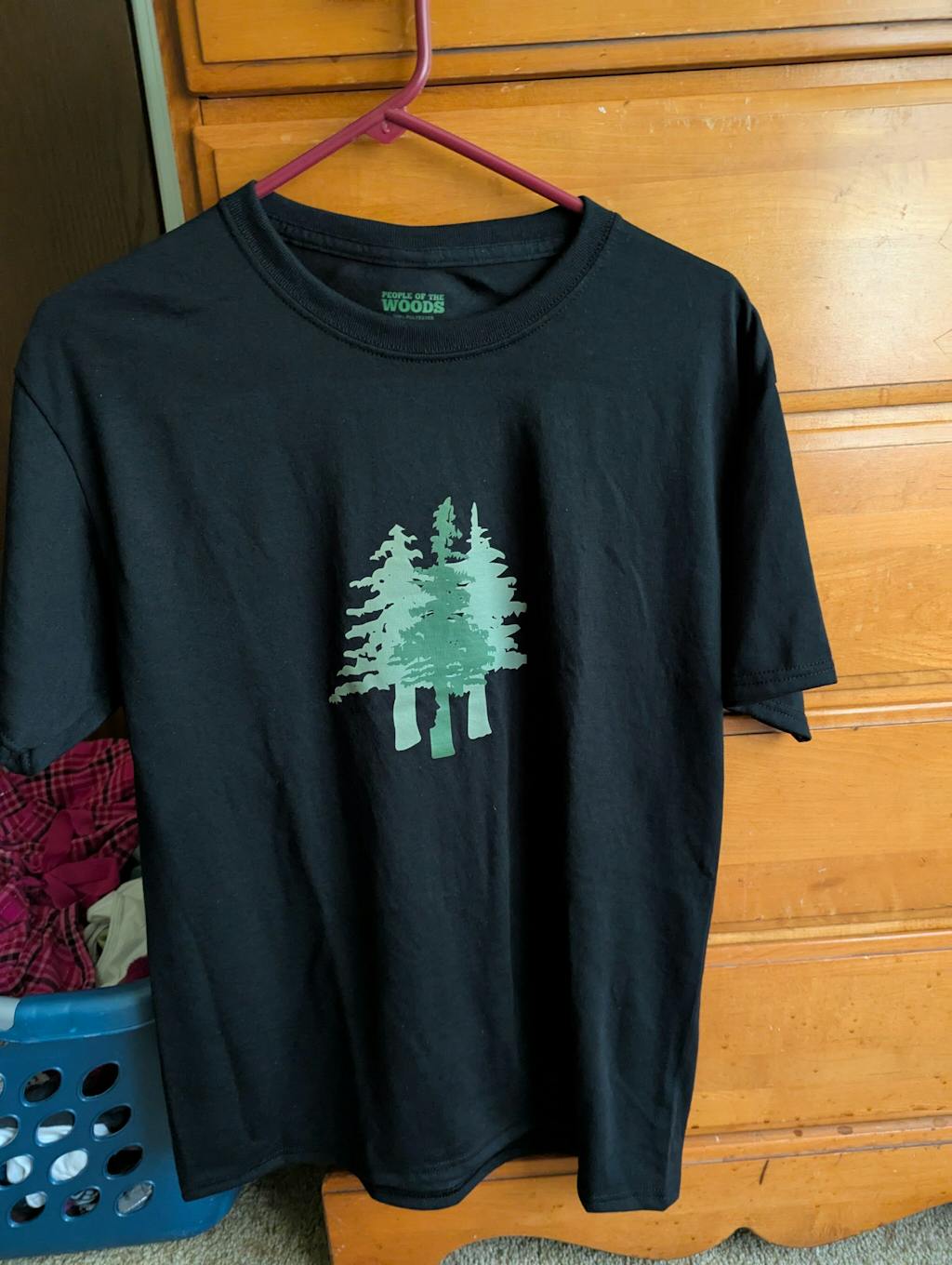 Great quality shirt at an affordable price I also got a very nice note in my package stating that they appreciated me supporting small business. I recommend people of the woods to anybody great small company. Also, the coffee cup is of good quality and the people of the woods stickers look great on my coolers and hardhat